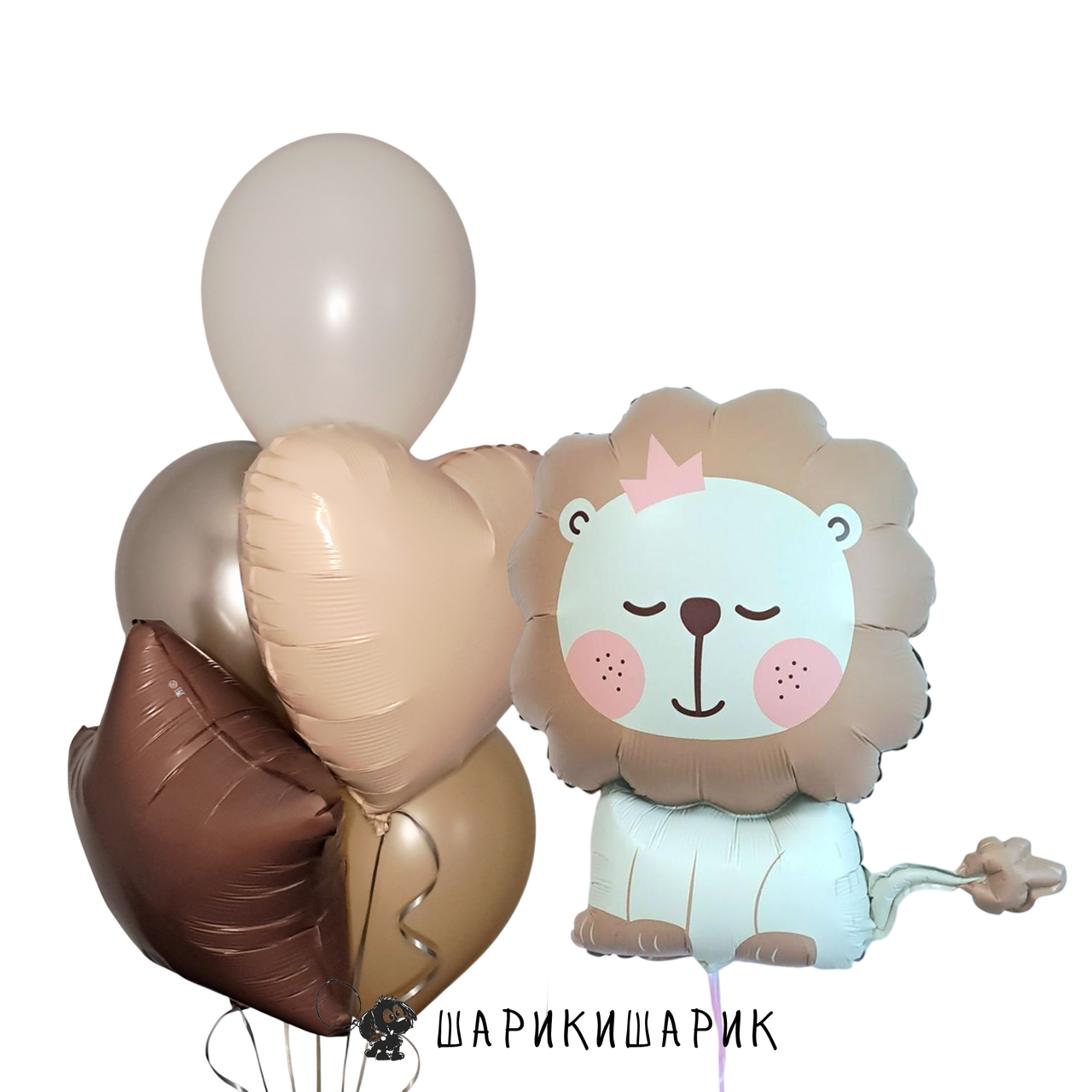 Фонтан из пяти шаров с сердцем и звездой "Кремово-шоколадный" и Львёнка