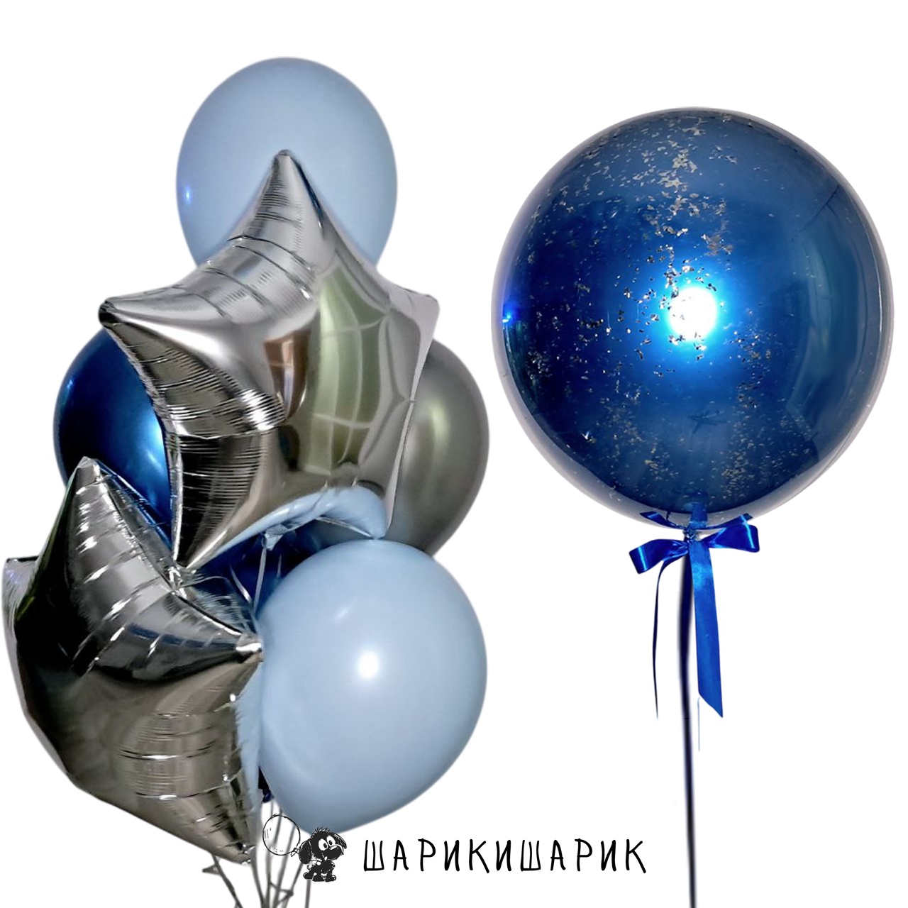 Набор из среднего фонтана с двумя звёздами и большого шара Bubble (бабл) c конфетти "Серебряно-голубая синева"