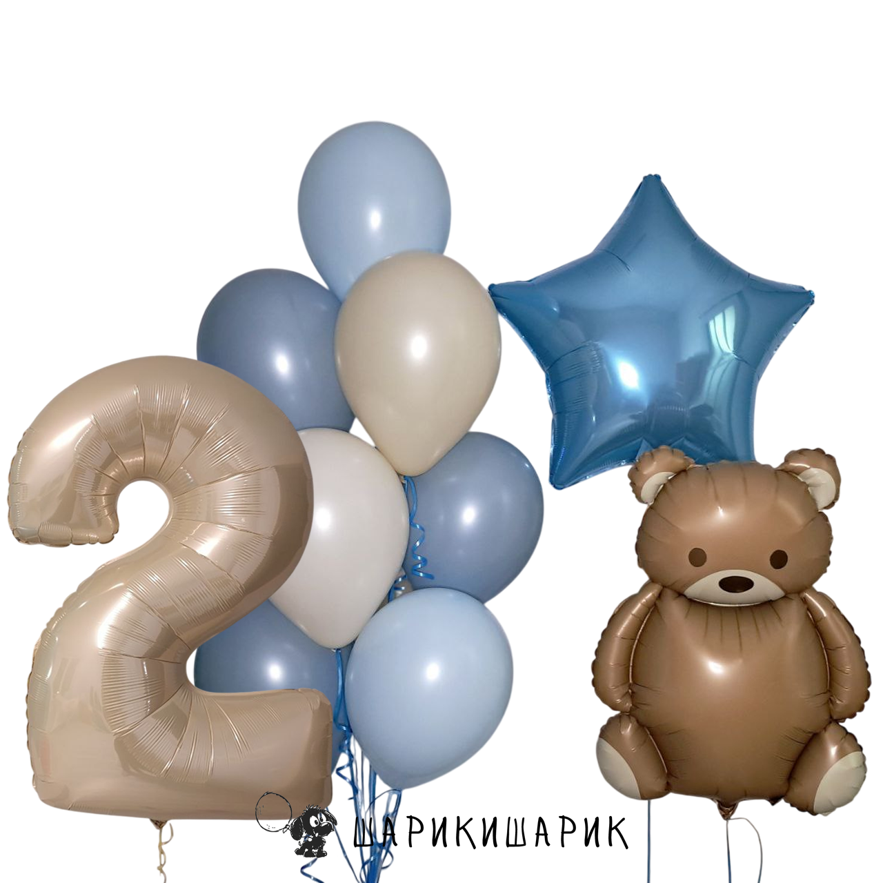Набор из десяти шаров, цифры с гелием и большой звезды с медведем "Бежево-голубой"