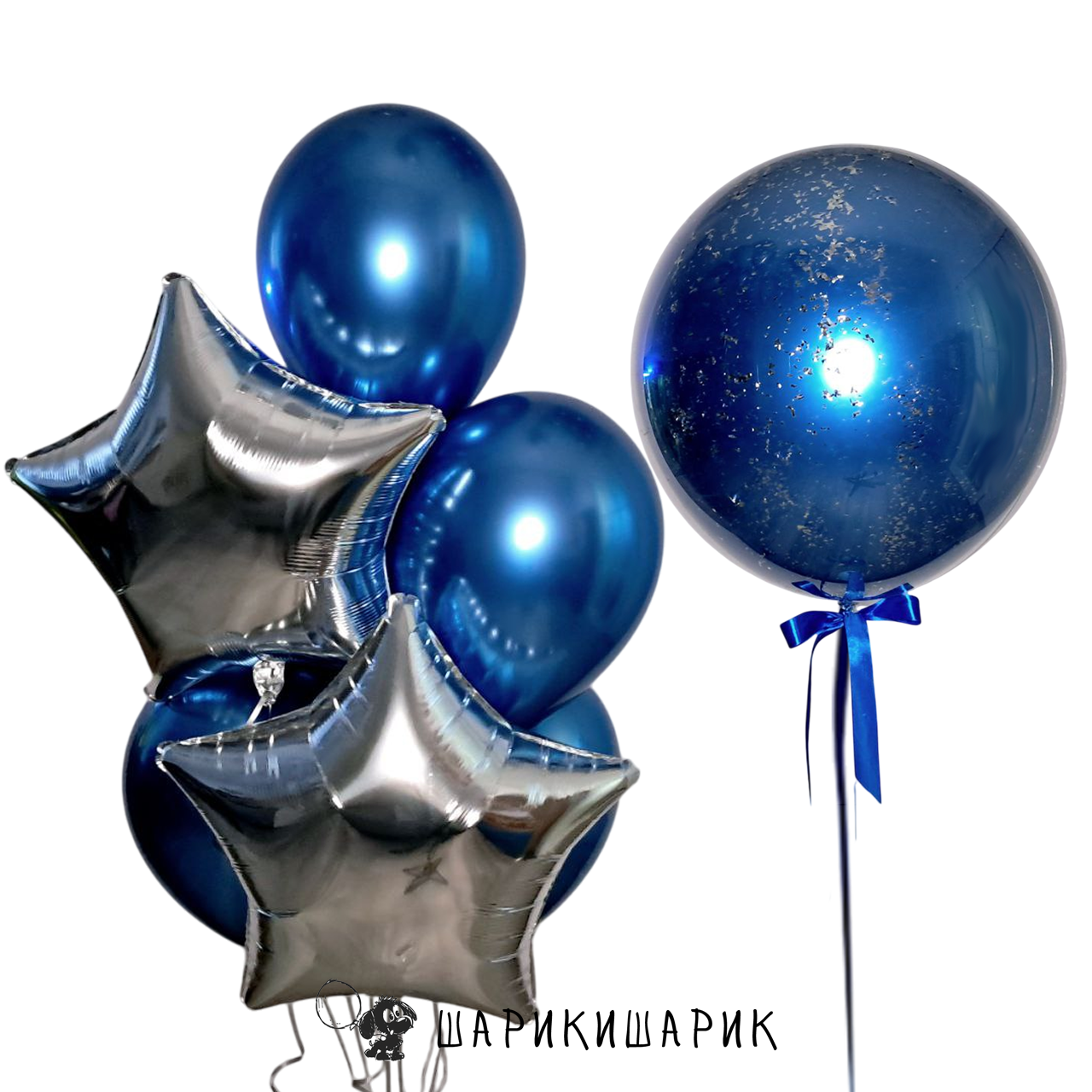 Набор из среднего фонтана с двумя звёздами и большого шара Bubble c конфетти "Серебряно-синий"
