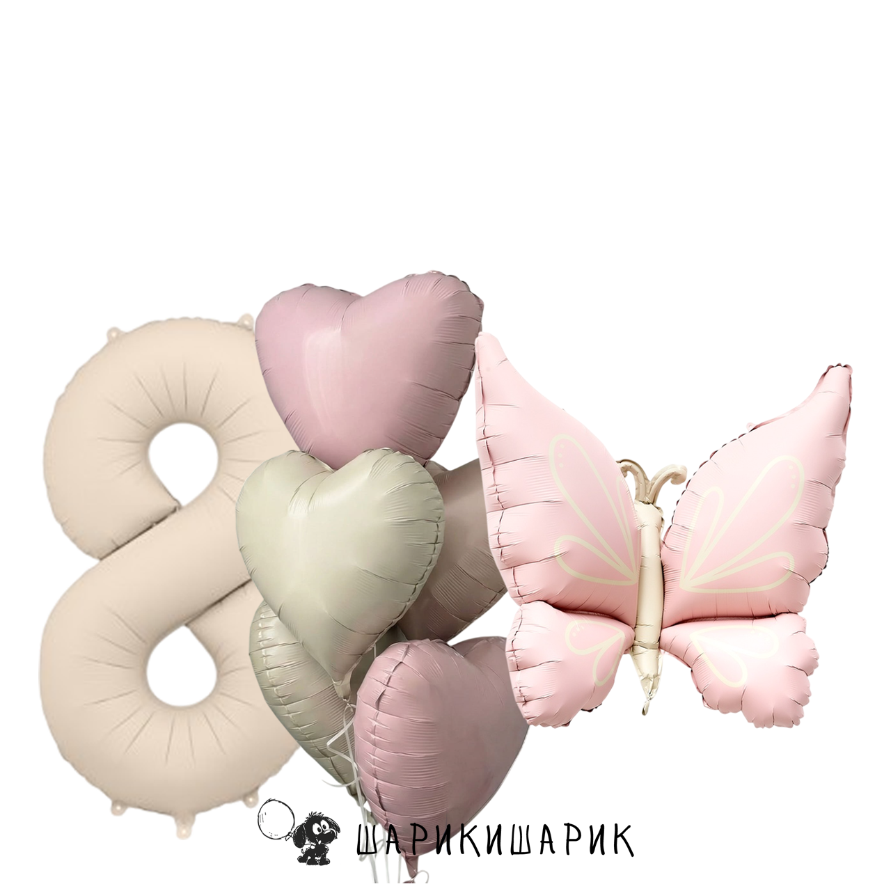Набор из кремовой цифры и фольгированных сердец и розовой бабочки
