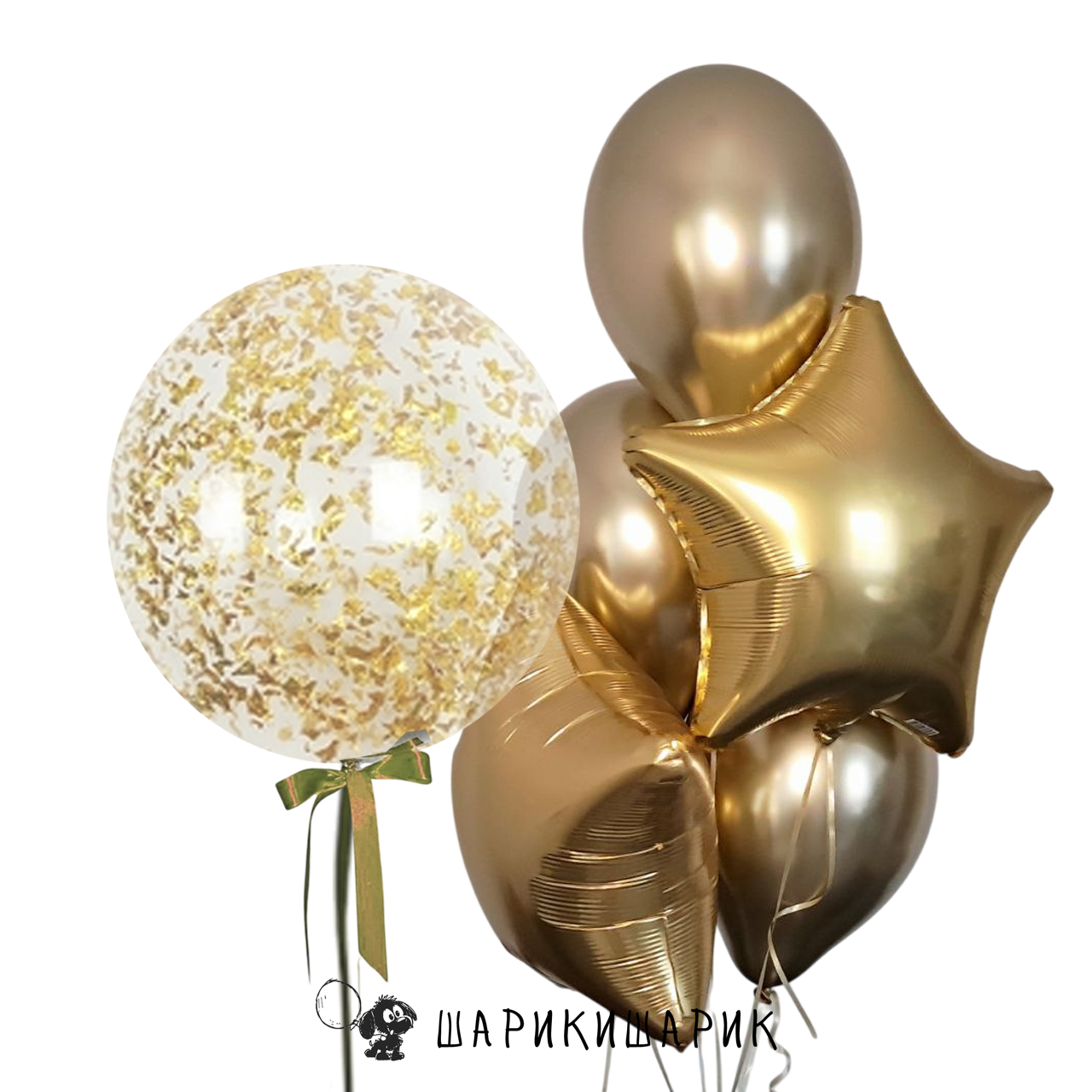 Набор из малого фонтана с двумя звёздами и большого шара Bubble c конфетти "Золото"