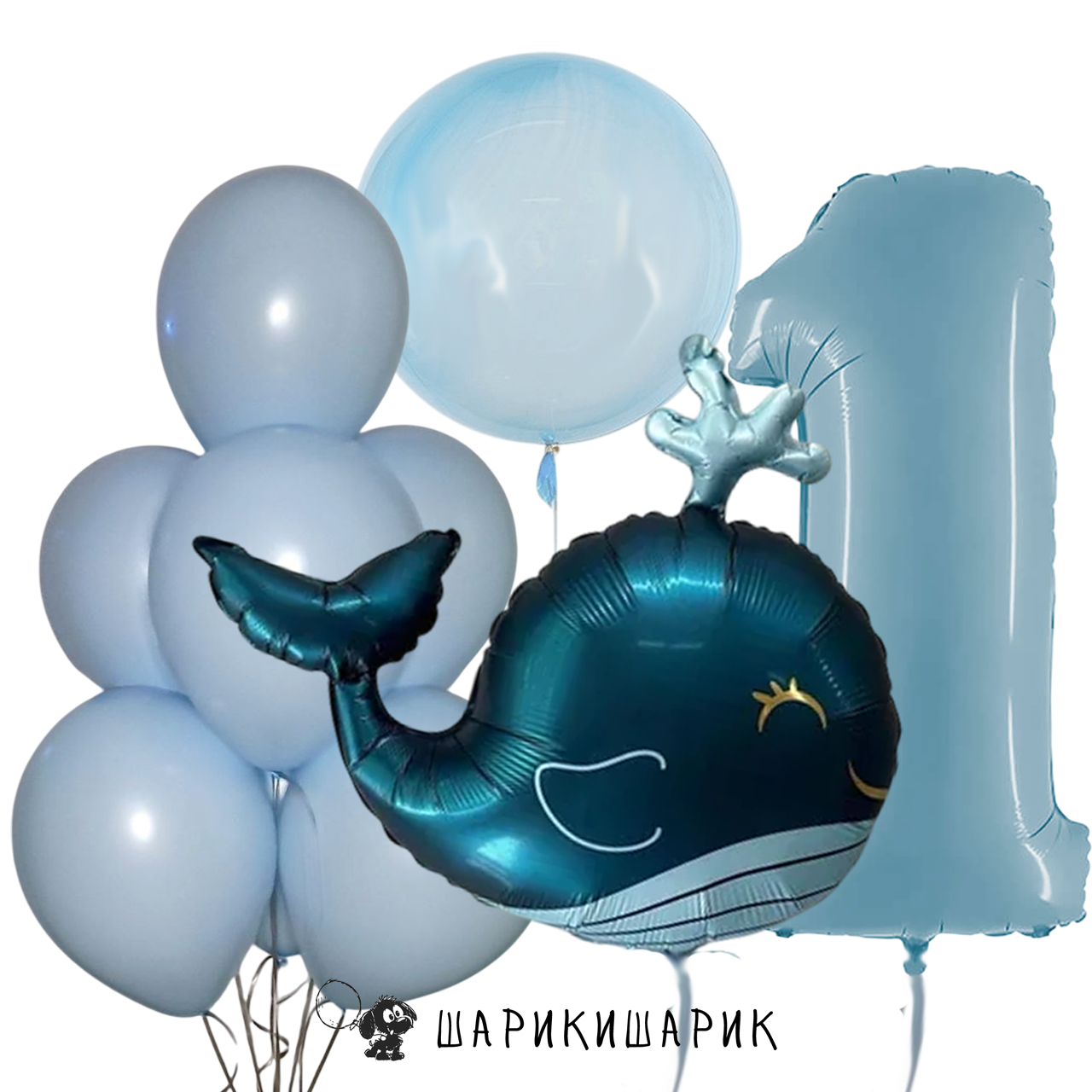 Набор из семи шаров, цифры, шара Bubble (бабл) 18" и кита "Голубой"