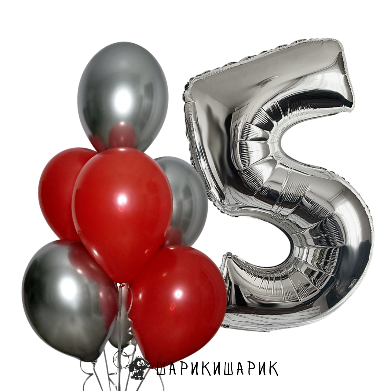 Набор из семи шаров и серебряной цифры с гелием "Красное серебро"