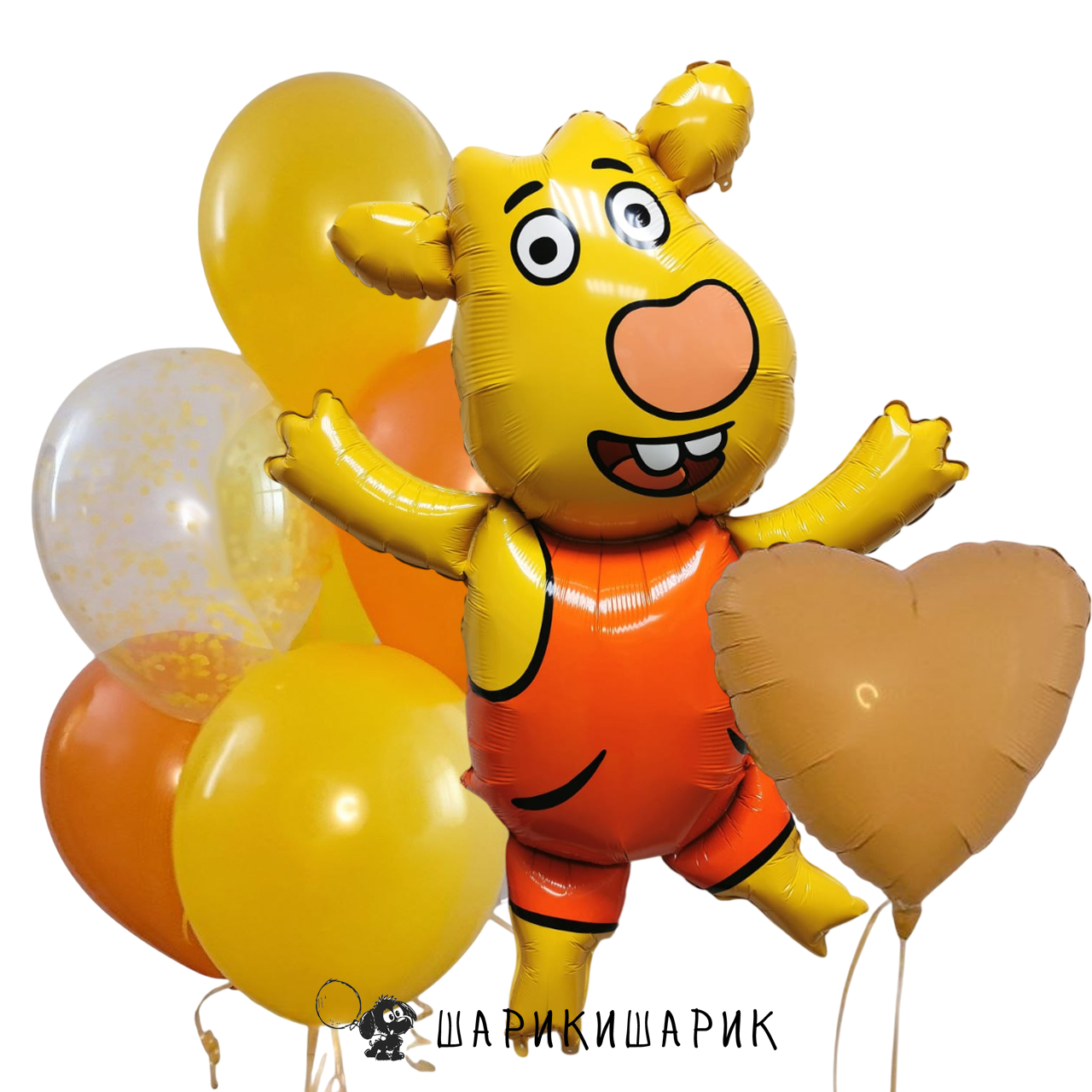 Набор из семи шаров, сердца 18" и фигуры "Оранжевая корова. Боря"