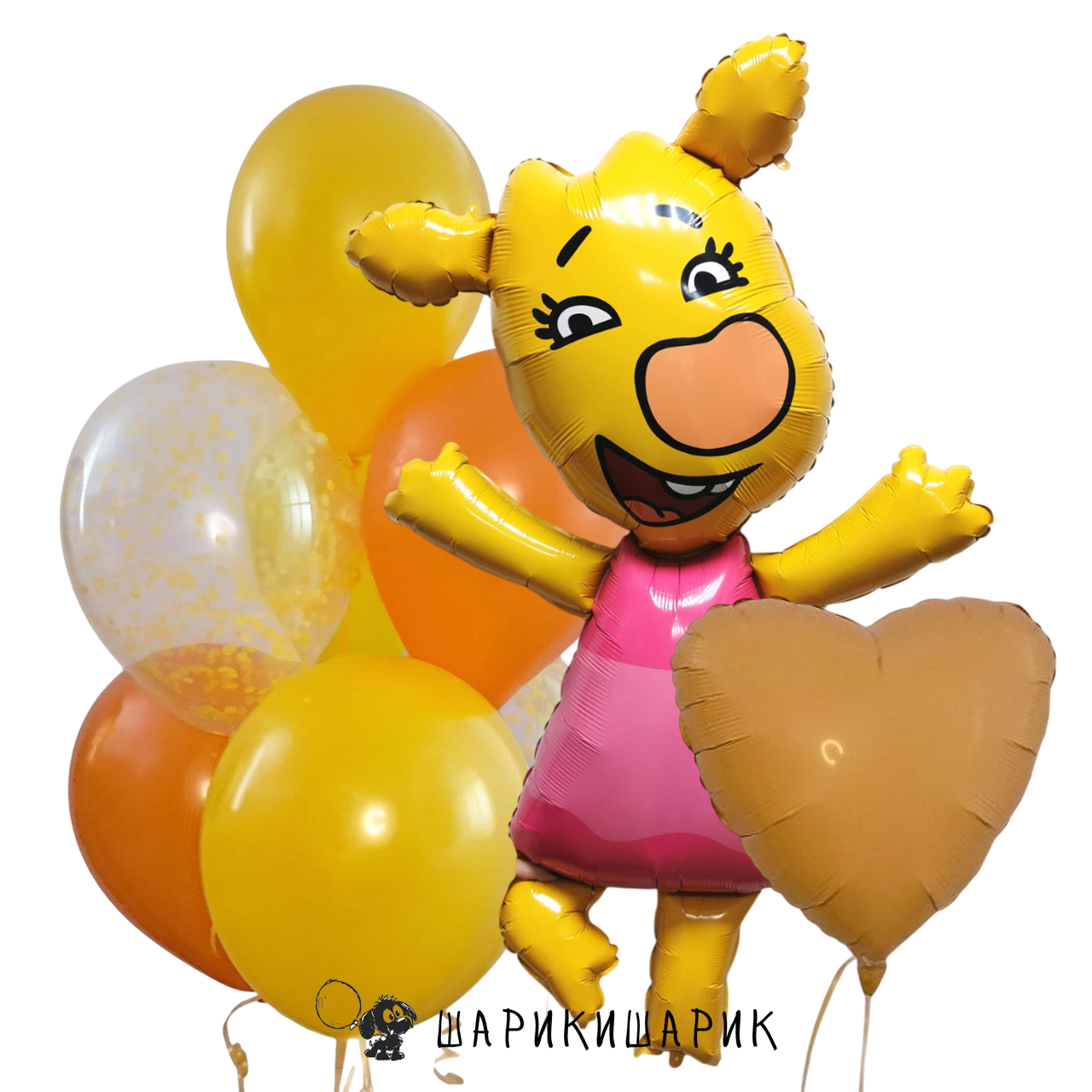 Набор из семи шаров, сердца 18" и фигуры "Оранжевая корова. Зоя"
